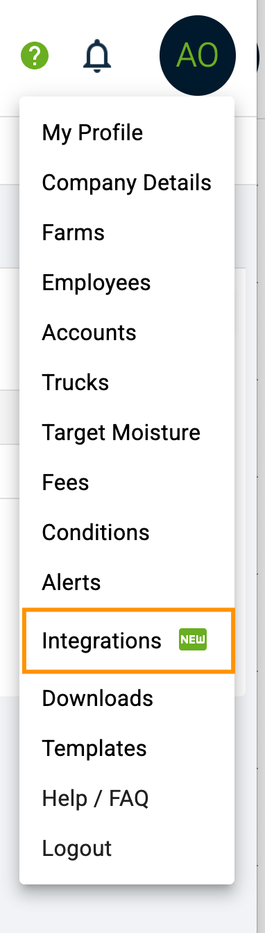 5. Navigate to AgriChain Dashboard and Go to profile menu and click on Integrations.