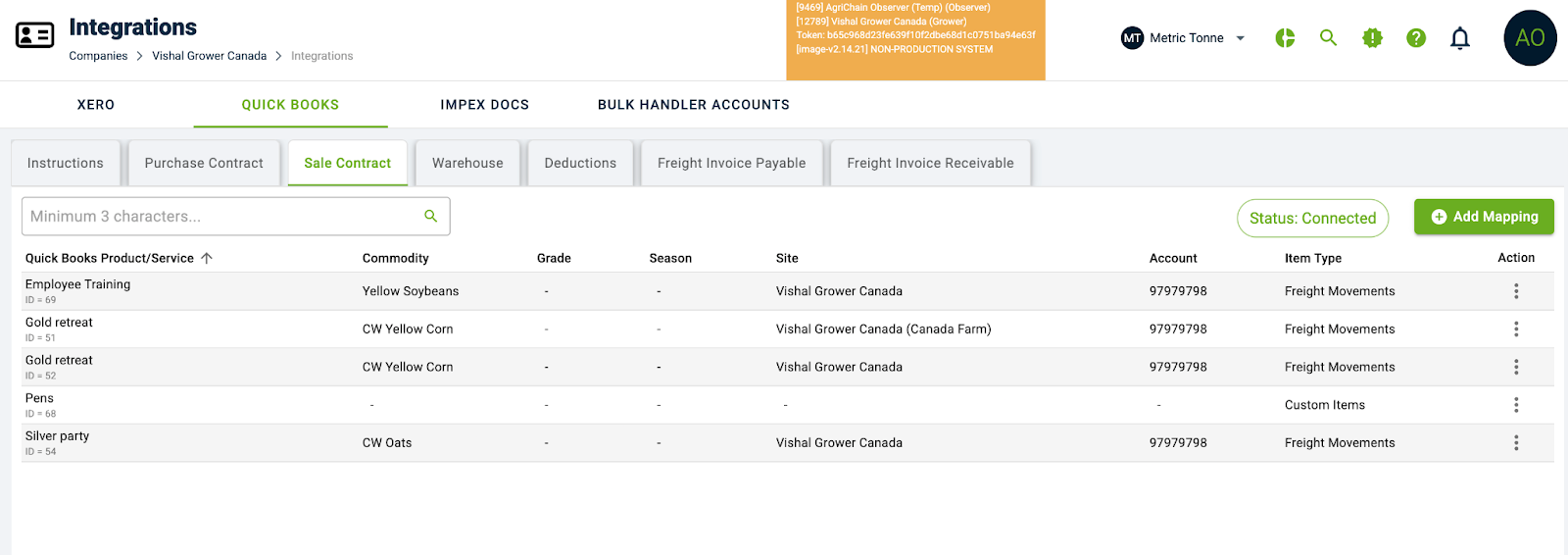 6. If the QuickBooks account is successfully linked and synced with AgriChain, then status will be Connected. Below which the product and services needs to be mapped.