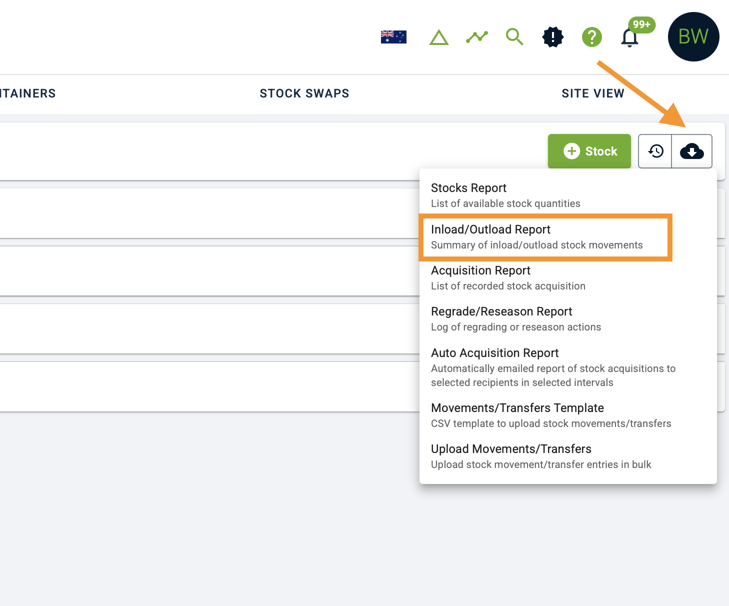 - Select Inload/Outload Report from the CSV button in the upper-right corner