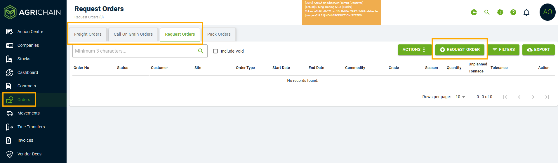 - In your 'Orders' section, depending on your order type, create an Order by clicking on the green '+ FREIGHT ORDER / CALL ON GRAIN ORDER / REQUEST ORDER' button.
