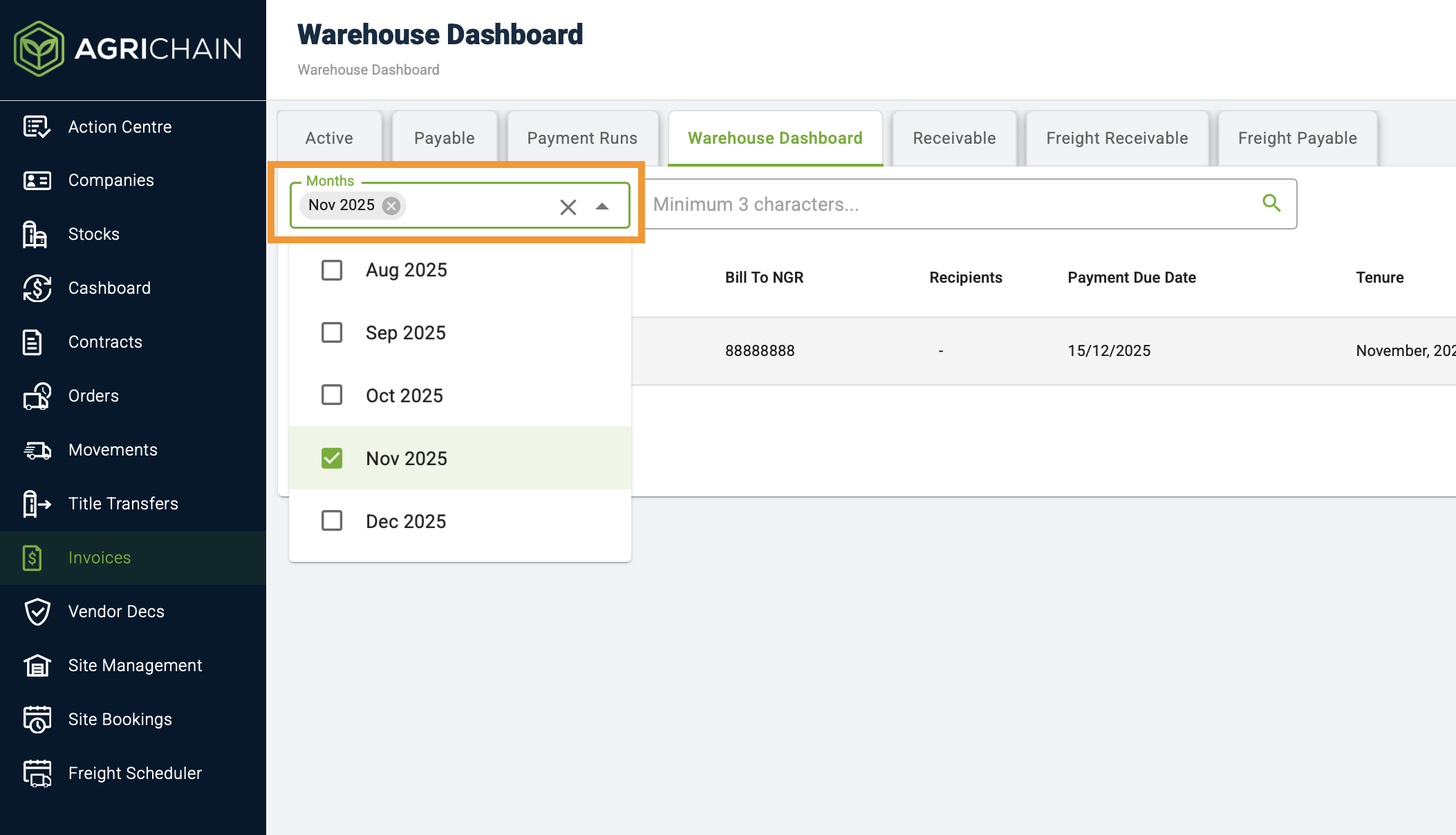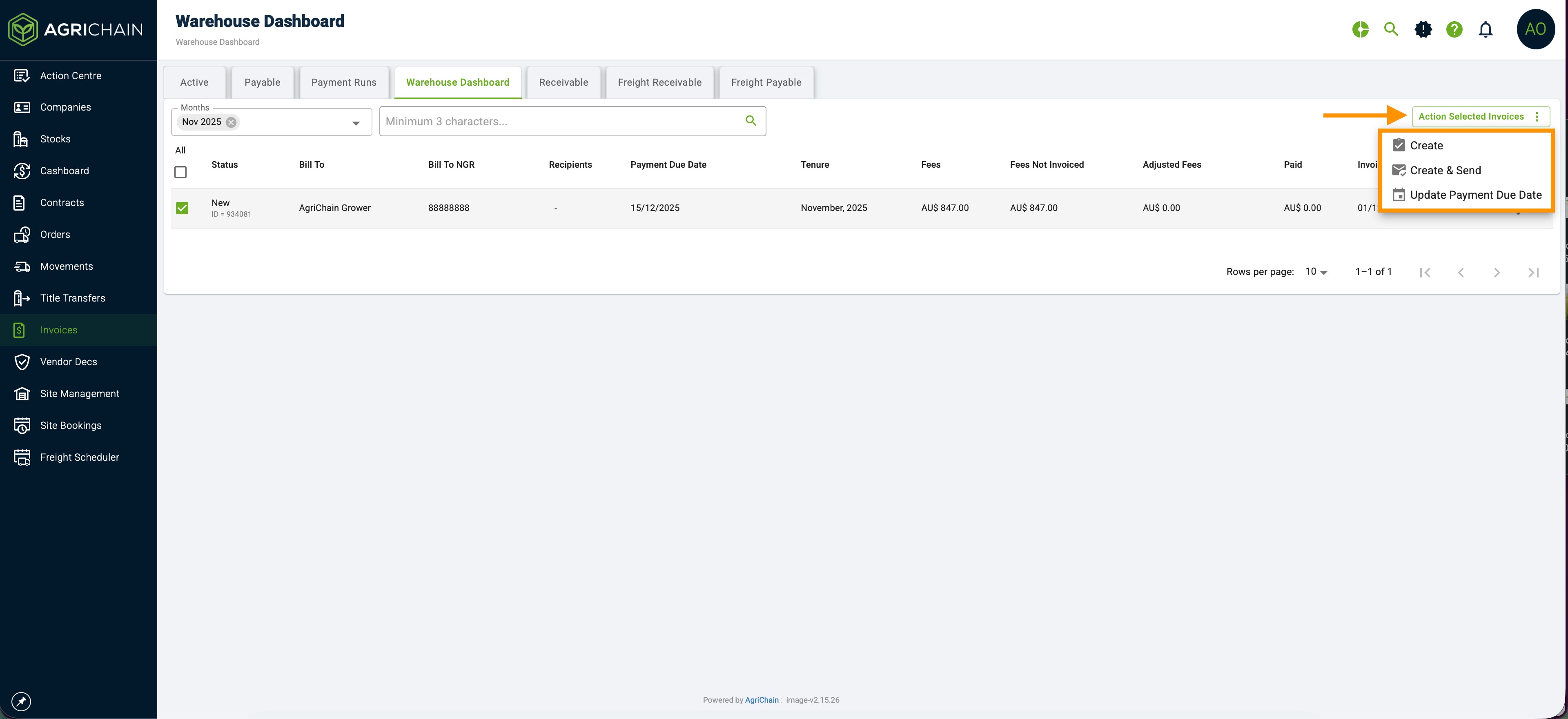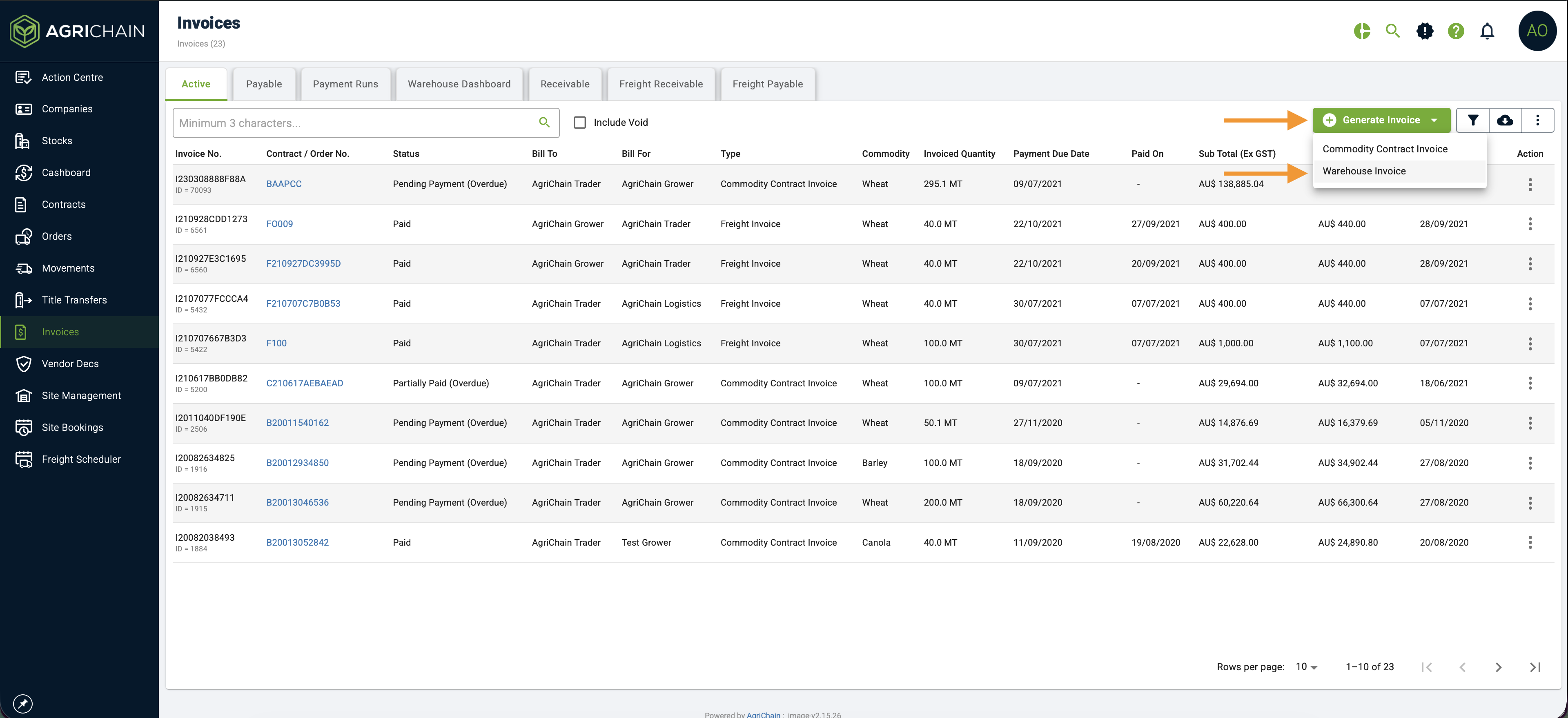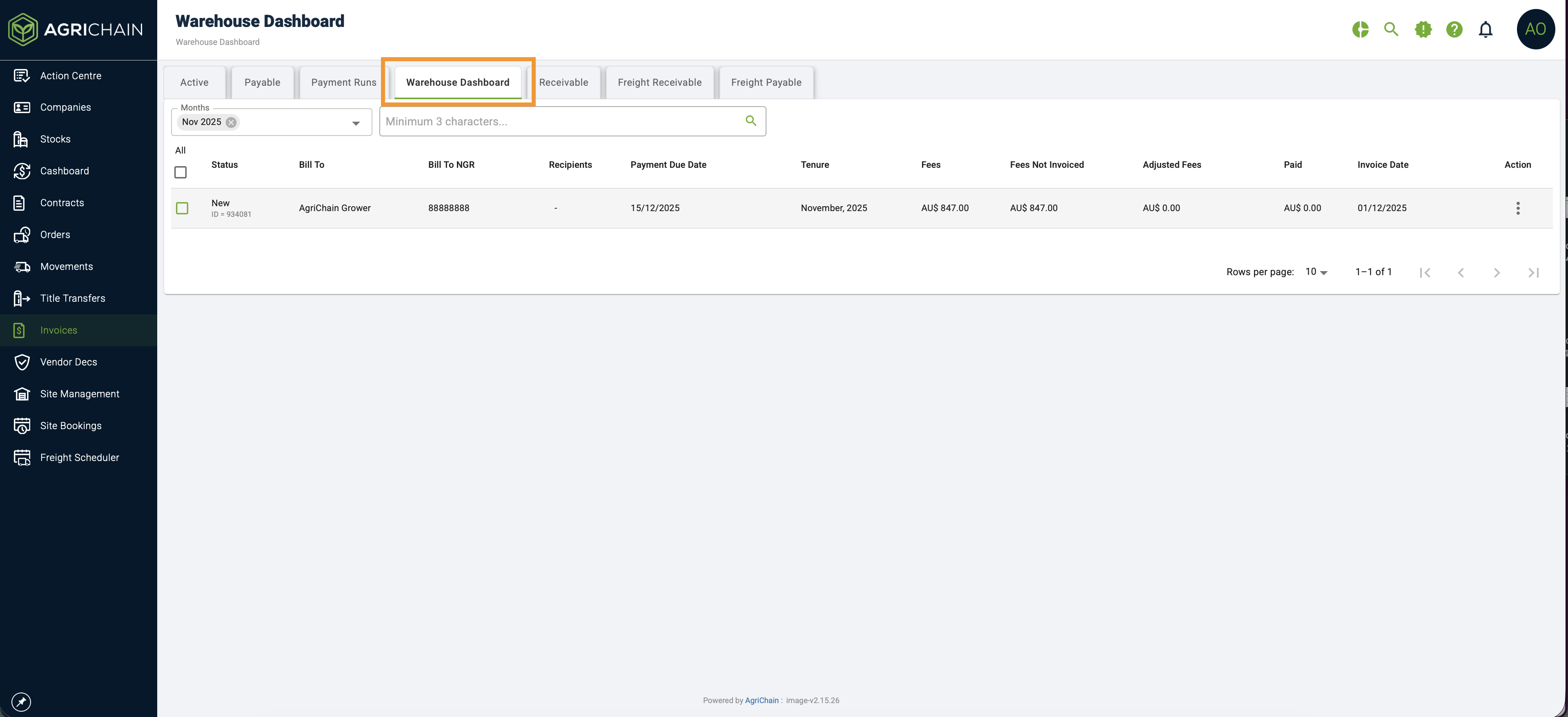 In AgriChain, warehouse invoicing is the process of charging growers, traders, or any party that stores stock in a Bulk Handling Company (BHC) site. If the BHC has configured applicable fees such as storage fees, inload fees, and outload fees it has the authority to raise invoices against the stock held.