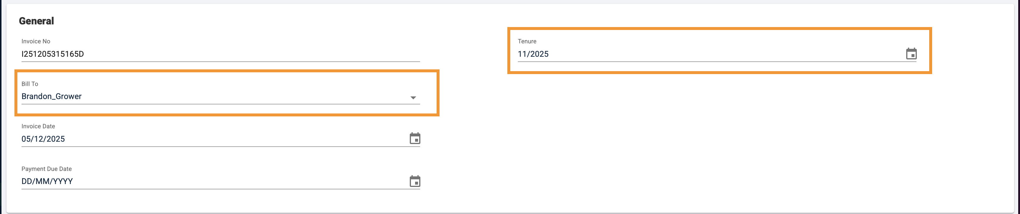 - Enter the party you would like to invoice, the tenure (monthly or weekly), and payment due dates.