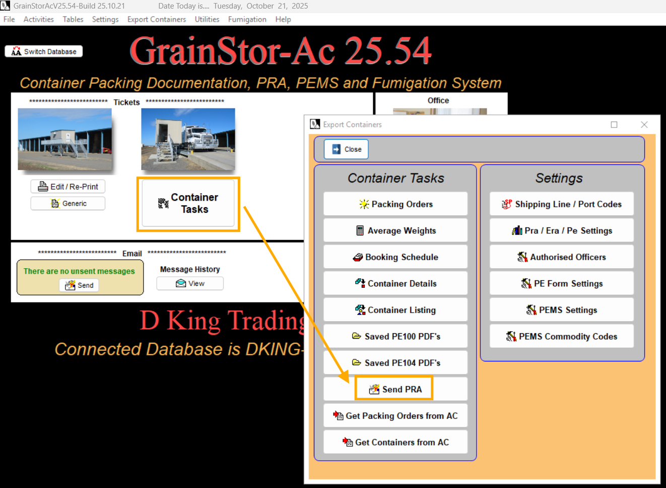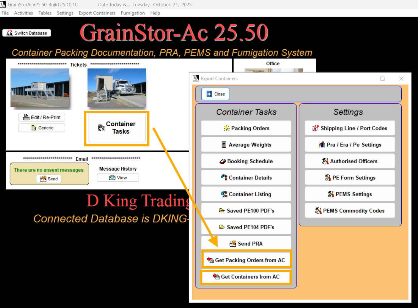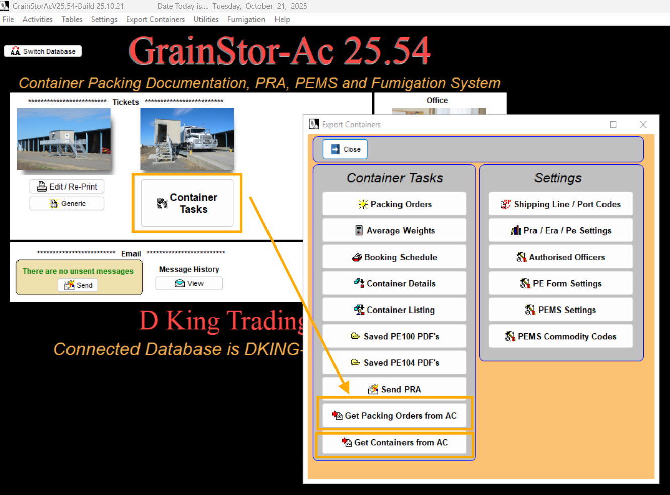 First, retrieve the Pack Orders from AgriChain into Grainstor by selecting ‘Container Tasks’ → ‘Get Packing Orders from AC’.