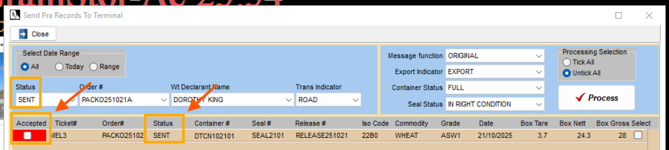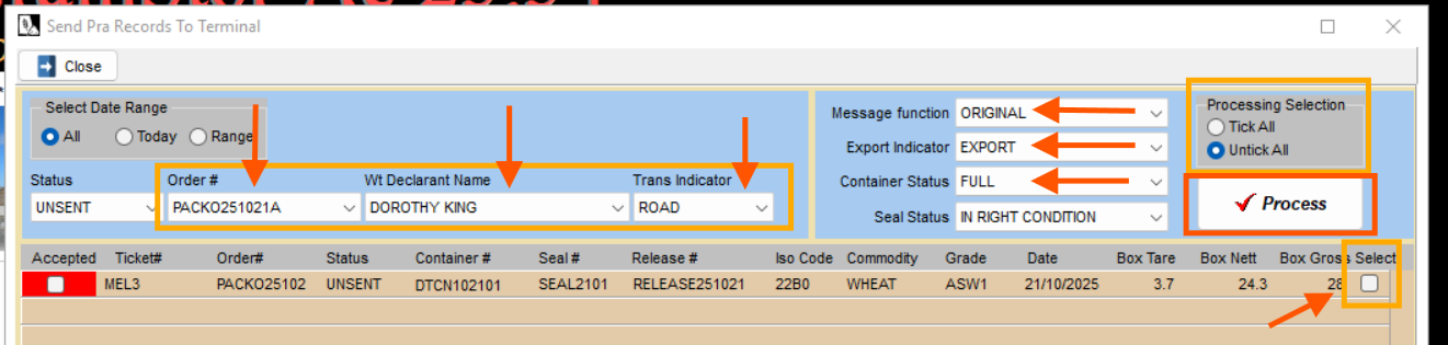 Next, select the ‘Order #’ (Pack Order No.), ‘Wt Declarant Name’ (Authorised Officer) and ‘Trans Indicator’ (Transportation) for the containers that will have their PRA records sent to the terminal.