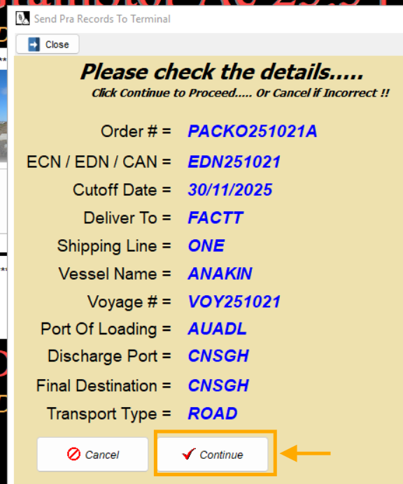 A final confirmation will pop-up again and proceed by selecting ‘Yes’ to send the container’s PRA record to the terminal.
