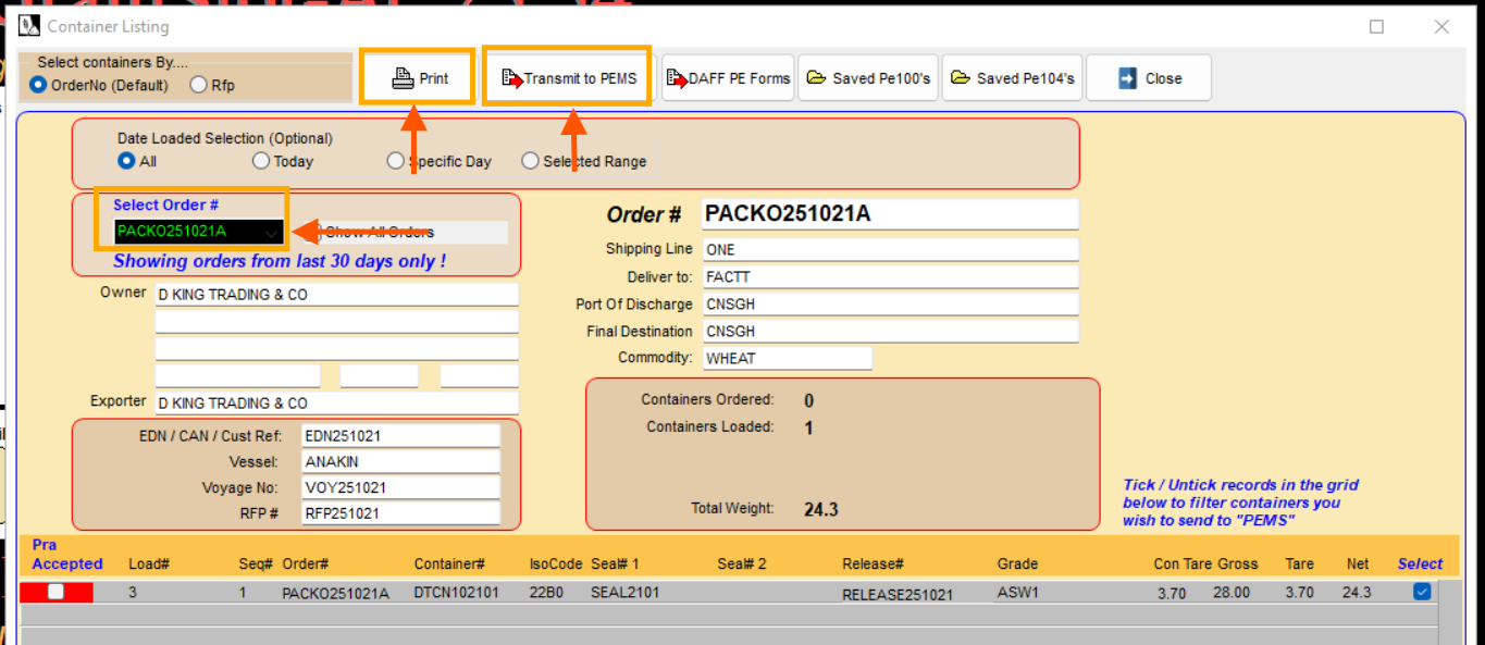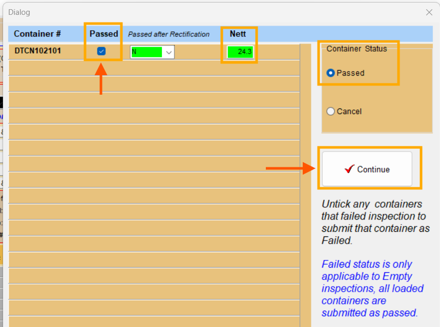 After selecting ‘Transmit to PEMS’, a pop-up will appear with containers against the selected pack order. Select (tick) the containers that you would like to submit to PEMS with ‘Container Status’ as ‘Passed’ → then Select ‘Continue’