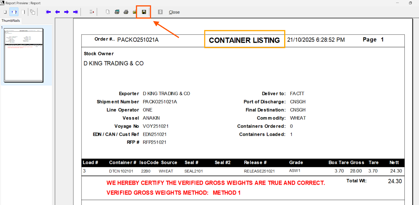 You will also have the option to save as a PDF or print the ‘Container Listing’ file but selecting ‘Print’.