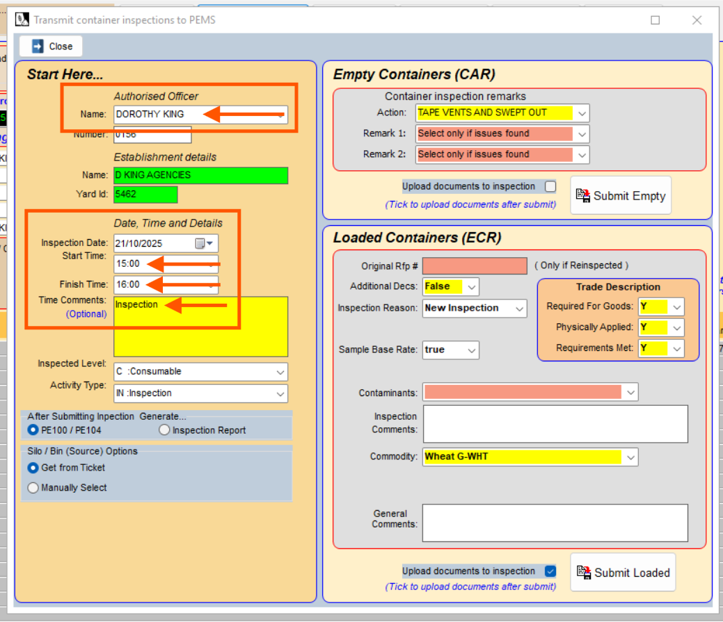 Another pop-up will appear for you to transmit the container inspection records to PEMS. Here, select the name of the ‘Authorised Officer’ → Nominate the inspection ‘Start Time’ and ‘Finish Time’ → Add any ‘Time Comments’, if applicable.