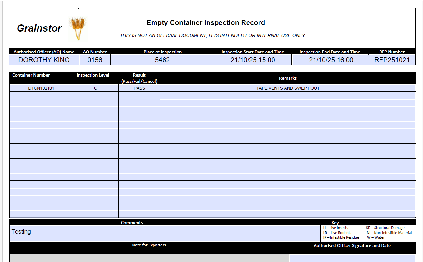 If successful, an ‘Empty Container Inspection Record’ file can be generated.