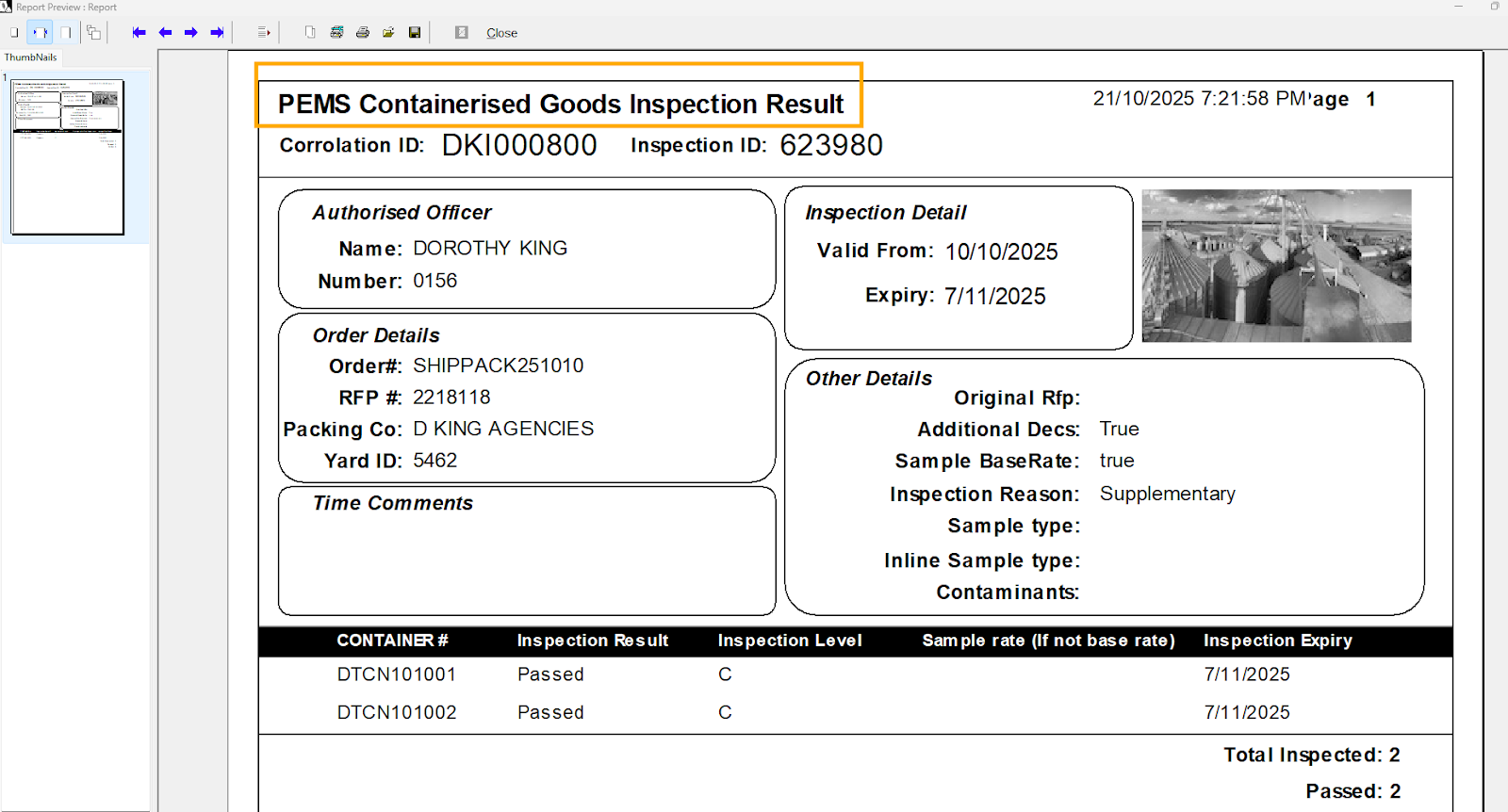 If successful, a ‘PEMS Containerised Goods Inspection Result’ file can be generated.