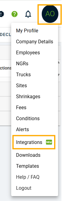 From your AgriChain Profile Initials in the top right-hand corner of the page, go to the 'Integrations' page.