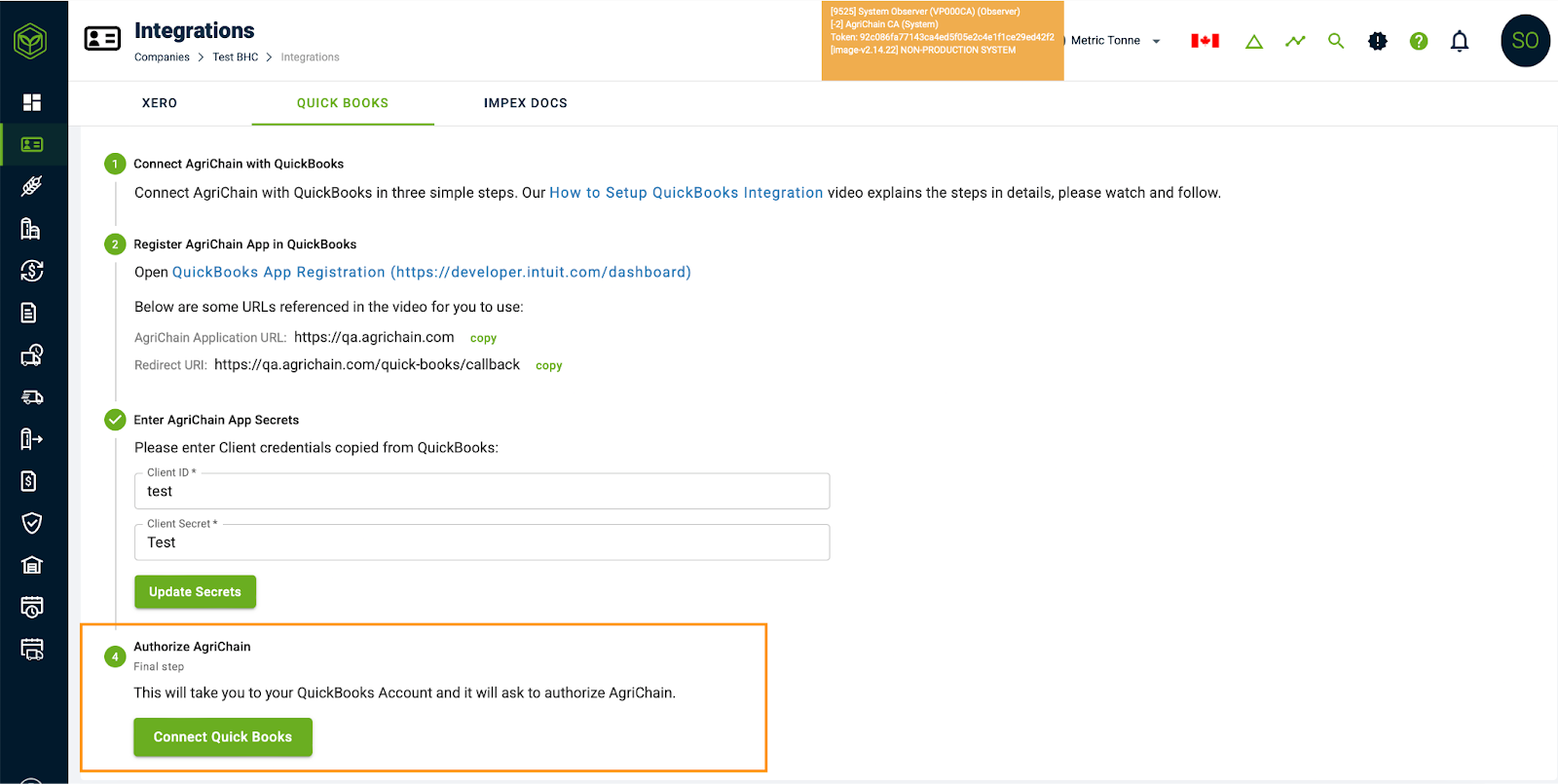 From there, Item Number 4 - 'Authorise AgriChain' will be activated and click on the 'CONNECT QuickBooks' button to proceed.