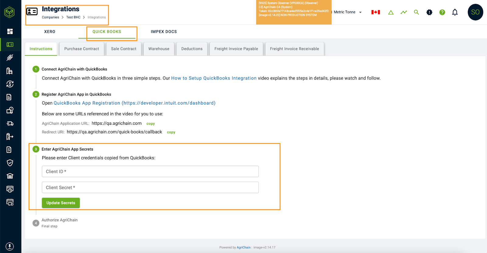 Go into your QuickBooks Account (not AgriChain) and obtain your QuickBooks Client ID and Secret (copy both of these).
